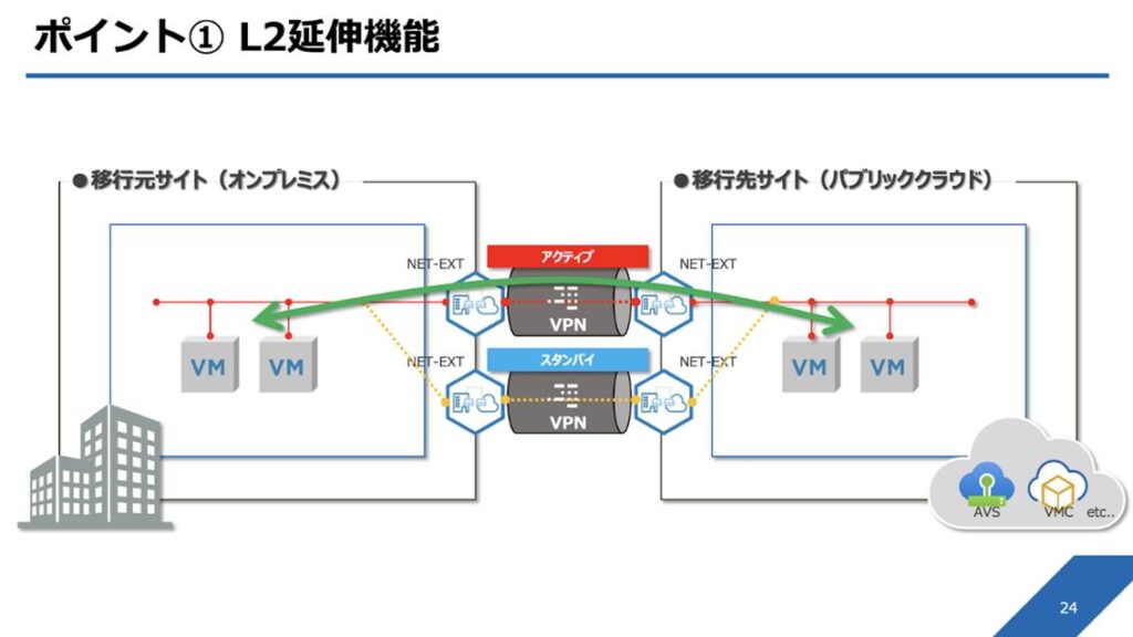 HCXの機能の中でも「L2延伸」が特に重要な役割を果たしていると聞きます。この機能がデータセンター移行でどのように役立つのか、詳しく教えていただけますか?