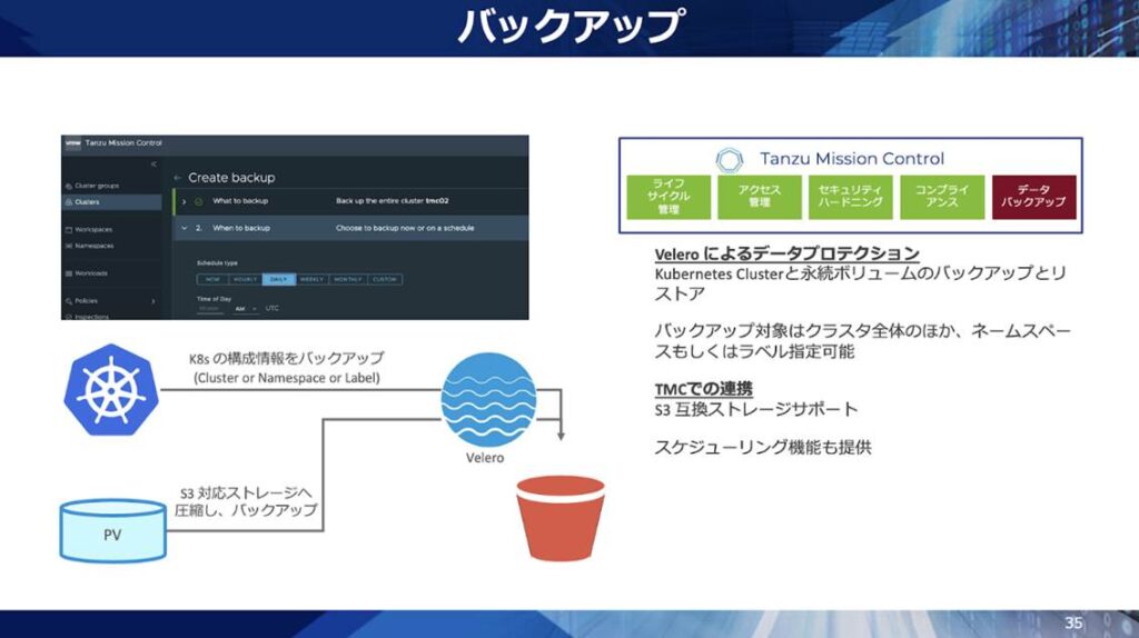 Kubernetesクラスタの運用ではバックアップが非常に重要な課題と聞いています。TMCが提供するバックアップ機能について、詳しく教えていただけますか?