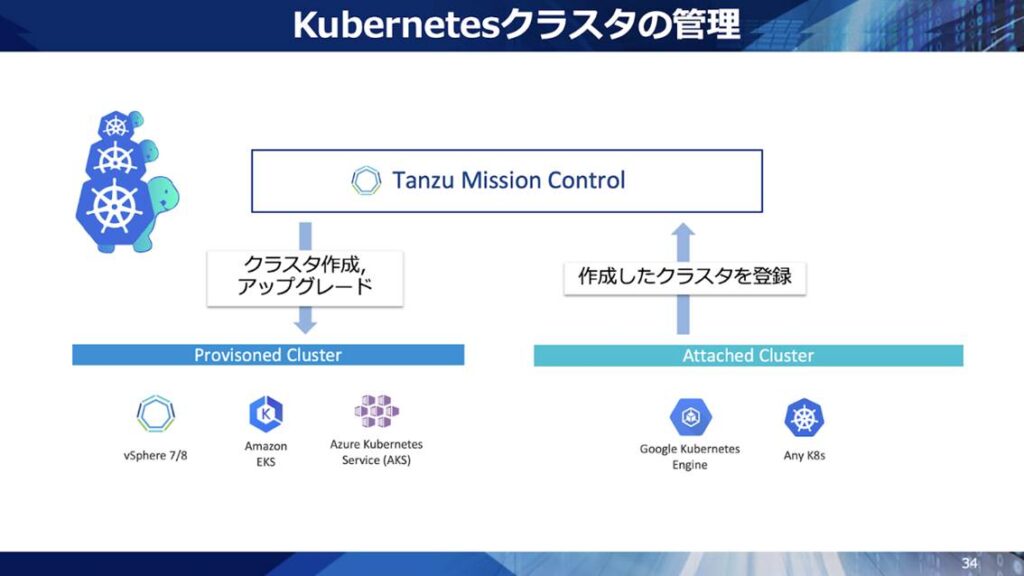 プロビジョンドクラスタは、TMCを通じて直接作成されるクラスタで、TMCのインターフェースから操作が可能です。一方、アタッチドクラスタは、既存のK8sクラスタをTMCに登録して管理するものです。プロビジョンドクラスタではアップグレードなどの操作も可能ですが、アタッチドクラスタでは基本的な管理に限定されることが多いです。ただし、この2種類を組み合わせて運用することで、既存環境を活かしつつ新しいクラスタの管理を統合する柔軟性を持つ運用が可能になります。