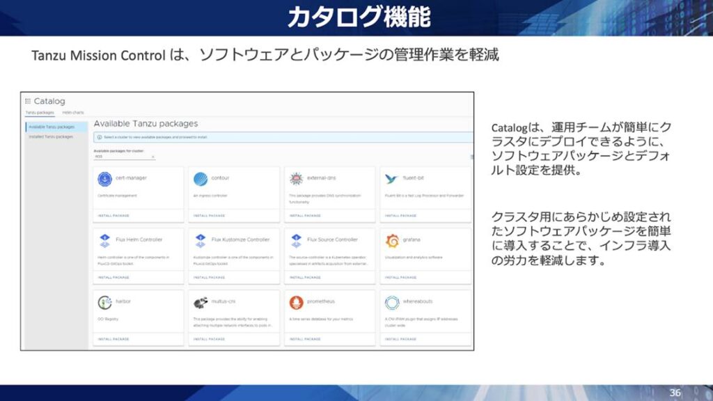 TMCのカタログ機能は、Kubernetes環境で役立つオープンソースソフトウェア(OSS)を簡単に導入できる仕組みを提供します。このカタログには、VMwareが事前に検証し、サポート対象としているOSSが含まれています。具体的には、監視ツールやロギングツール、可観測性を向上させるソフトウェアなどが例に挙げられます。